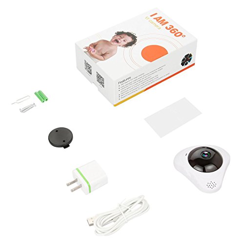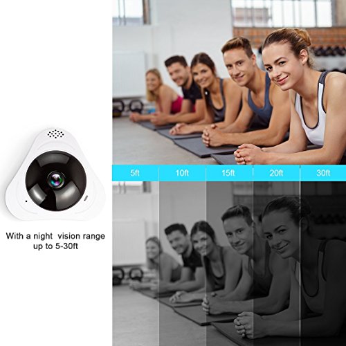 -. Feature : 【Easy to Use-Sonic Wave Connection】Just need one step to connect your camera,enter your wifi and password,and then the phone to send a sonic wave,you just need to wait the camera connection your wifi. / 【Fish Eye Panoramic Review】360 degree fisheye Wi-Fi IP camera without blind spots.See the entire room in stunning HD video quality during the day or at night(with Night Vision).HD 960P Video format:1280*960P(1.3MP) / 【Motion Detection】Get informed about every movement in your house, The motion detection sensors 'feel' it when something is moving in the room and will let you know immediately. It will take a picture and push a message on your phone. Perfect for surveillance! / Mobile Devices and NOTES】 Record, store and review footage using a Micro SD card(Minimum support 8G, Maximum 128G) and manage directly from your mobile device; Alert pictures will be stored on the SD card, and you can playback the videos on your phone. Loop recording: When the memory full, it will auto cover the oldest video files. / 【IR Night Vision】Night vision up to 30feet - Never miss a moment, day or night, with visibility up to 30 feet in complete darkness.