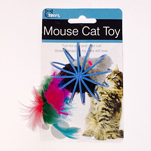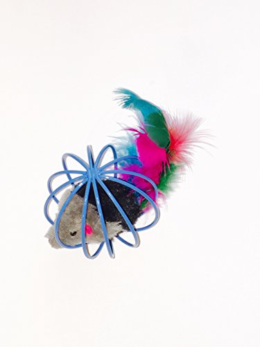 -. Feature : Small plush mouse with a colorful feather tail caged inside a metal wire ball.