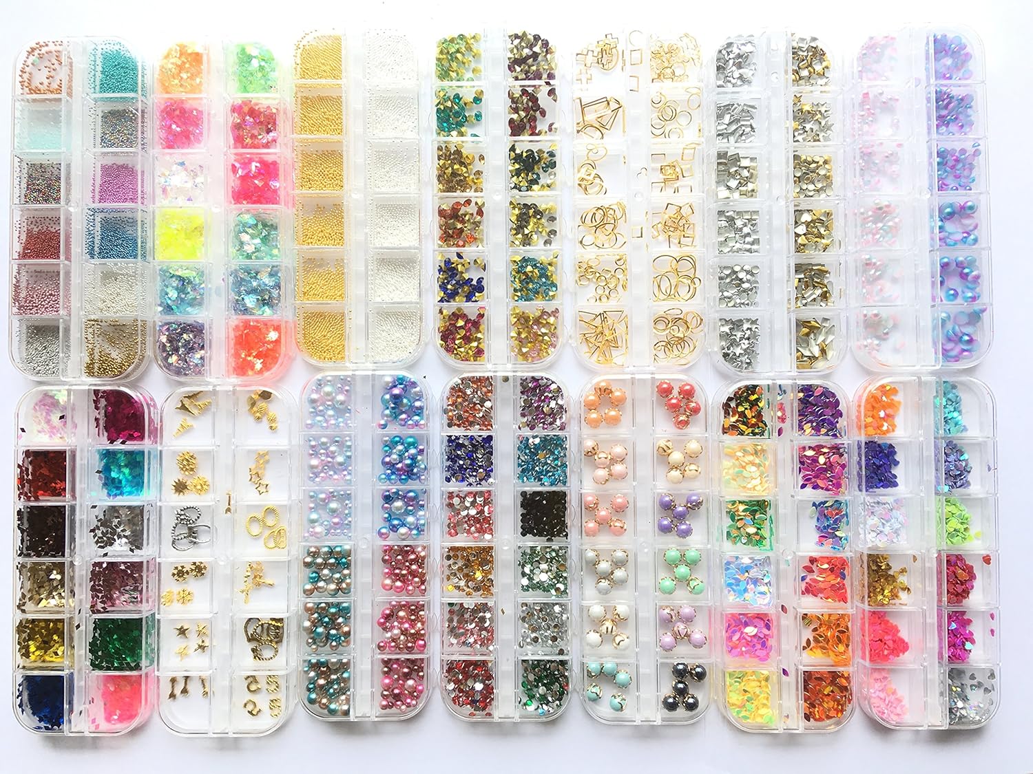 パターン:タイプA(14種類) ネイルアートやデコ、レジンにお使いいただける、パーツの14種類セットです。 通常の丸いタイプのケースよりこちらのケースの方が大容量になります。 内容:ブリオン(多色、金銀)、ホロ(2種類)、アクリル製ラインストーン、金属パーツ(多角形)、ごろっとした多色パール、チャトン(V底)、パール(平底&丸形)、スパンコール(オーバル多色、ハート多色、金銀多角形フレーク)の全14種類です 丸形の容器の物に比べて容量はかなり多いタイプになります!