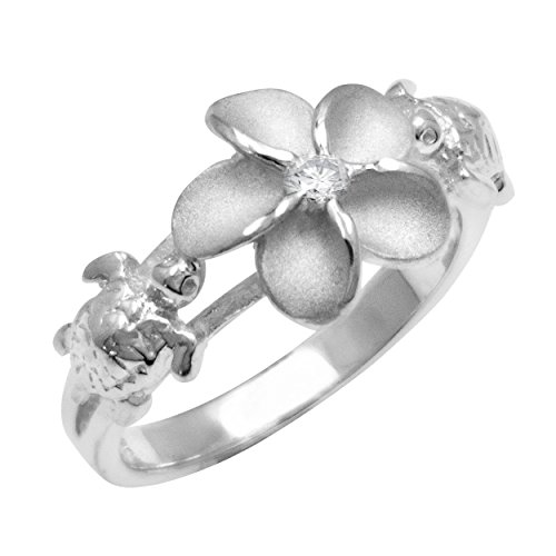 -. Binding : Jewelry -. Brand : Honolulu Jewelry Company -. Department : womens -. Feature : Plumeria Represents Perfection And The Bond Between Everything Good / Turtle = Symbol for Good Luck / Cubic Zirconia Adds Additional Sparkle / A Lovely Gift from the Hawaiian Islands / From Honolulu Jewelry Company, Honolulu, Hawaii -. Label : Honolulu Jewelry Company -. Manufacturer : Honolulu Jewelry Company -. Model : SR2321 -. ProductGroup : Jewelry -. ProductTypeName : FASHIONRING -. Publisher : Honolulu Jewelry Company -. Studio : Honolulu Jewelry Company -. Title : Sterling Silver Plumeria and Turtle Ring with Clear CZ and Satin Finish