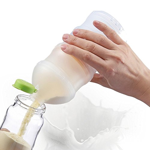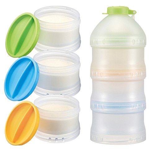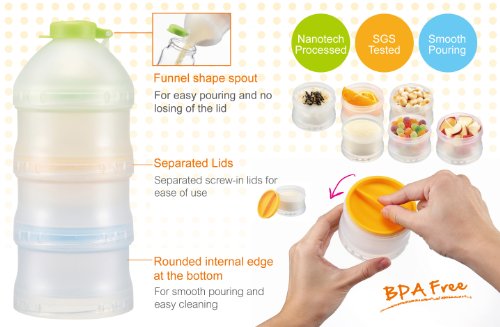 Food grade polypropylene material, SGS Tested and BPA free. Withstand temperature from -4°F to 248 °F, freezer and dishwasher top rack safe. Nanotech finished interior, smooth surface, leave no residue and easy to clean. All 3 containers come with individual colorful twist-lock secure lids. Screw in the top dispenser lid to any containers and instantly use it as formula dispenser