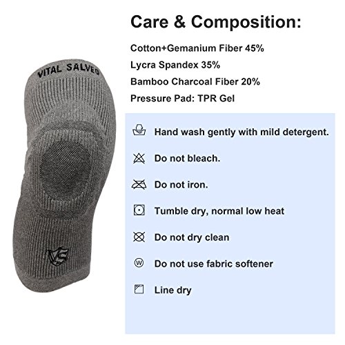 -. Feature : Professional Design -- Provides excellent compression support for warmth and increase circulation, which can help relieve pain, stimulate joints and improves injury recovery. / Ideal for Sports and Daily Wear -- Created with 3D breathable weaving allows you wearing for long hours. Unlike hard knee braces that restrict the range of motion, whether office, strenuous exercise or static activity, it will not interfere with any action. / Innovative Fiber -- Using germanium and bamboo charcoal material to make the physical activity get more energy. Released far infrared and negative ions improving blood flow, it can enhance oxygen delivery to promote knee performance and endurance. / Specific Design -- Extra pressure relief gel pad to prevent some light or mild collisions, massage surrounding area, stabilize the kneecap and reduce wear issue. High tension fiber strings on both sides to provide better fitting and prevent slips.