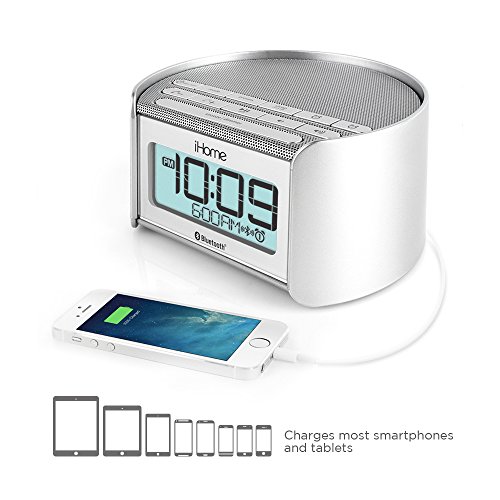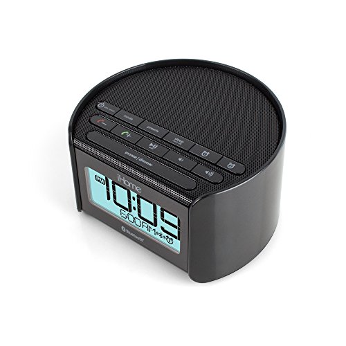 Break the tether with wireless audio streaming over Bluetooth with the IHM Bluetooth Bedside Dual Alarm Clock Radio with Speakerphone. Play your music over Bluetooth wireless connection or via the universal 3.5mm stereo connection while a 1-amp USB port keeps your mobile devices charged and ready to go. FM radio with 6 station presets keep your favorite music at your fingertips. Built-in mic, voice echo cancellation and answer and end controls make speakerphone use a pleasure. Dual alarms with dedicated alarm time display are sure to wake you in the morning.Feature