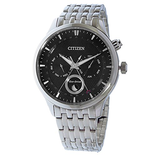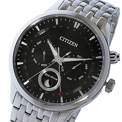 쿼츠,5기압 방수,에코 드라이브,멀티 캘린더(월요일 일(날) 일(날))고, 문 회 이의,컬러:블랙(문자판)고, 실버(벨트)