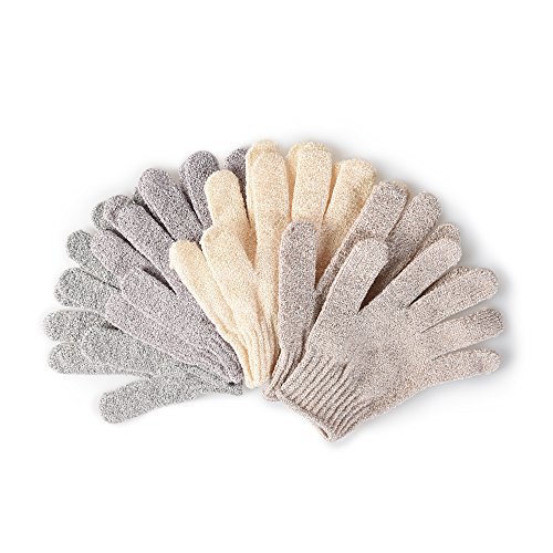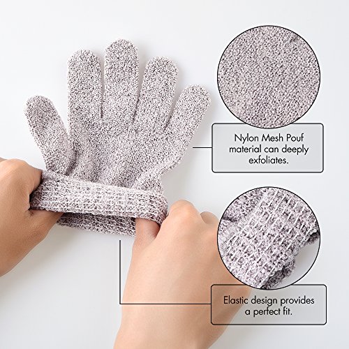 - Specification: There are 5 pairs Exfoliating Gloves in a pack with Multi color (Champagne, gray, gray purple, yellow) and two pairs of gray glove, 7.5×5.1 Inch and 34 grams each.