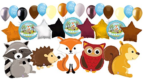 -. Feature : 1 - 26" Woodland Owl Shape Balloon, 1 - 36" Woodland Fox Shape Balloon, 1 - 30" Woodland Hedgehog Shape Balloon, 1 - 36" Woodland Raccoon Shape Balloon, & 1 - 36" Woodland Squirrel Shape Balloon / 3 - 18" "It's a Boy!" Woodland Creatures Round Balloon / 1 - 18" Orange Star Balloon, 1 - 18" Silver Star Balloon, 1 - 18" Black Star Balloon, 1 - 18" Burgundy Star Balloon, 1 - 18" Gold Star Balloon, & 1 - 18" Brown Star Balloon / 15 - 12" Mixed Latex Balloons (1 Silver, 1 Black, 2 Brown, 2 Ivory, 1 Orange, 1 White, 1 Burgundy, 1 Gold, 5 White "It's a Boy" P.R.Int on Light Blue) / Packaged & Shipped together without helium or ribbons