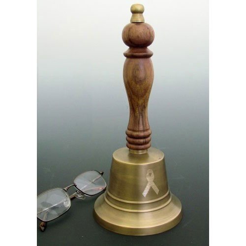 -. Feature : Antiqued finish solid brass hand bell / Engraved with cancer awareness ribbon / Sturdy wood handle / Weight: 1.5 pounds / Size: 4" Diameter x 9" High