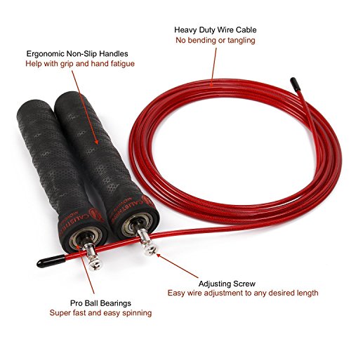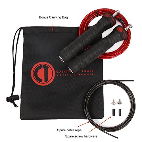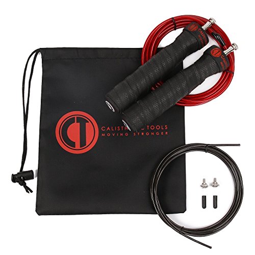 Studio : Calisthenic Tools Publisher : Calisthenic Tools Binding : Misc. Product Description Get your Calisthenic Tools High Speed Jump Rope and join Pro athletes all around the world on the most tried and true way to do your cardio and plyometrics. There are so many benefits to incorporating jumping rope to your daily workout routine. ? Jumping rope can increase the elasticity and resiliency of lower-leg muscles, leading to a reduced risk of lower-leg injuries. ? It can help improve your coordination. ?It burns fat fast and at the same time strengthens your connective tissues so you are ready to perform. ? It builds agility and quickness. ?I Jump ropes are extremely portable, which makes them an excellent option when traveling. The portability of jump ropes make them an excellent option for outdoor workouts at your favorite park or exercise course. ? The CALISTHENIC TOOLS High Speed Jump Rope's smooth ball bearing design will have you doing those very desirable DOUBLE UNDERS in no time. ? Great for any fitness level. ? Perfect jump rope for CrossFit, Boxing, MMA, and Home/Gym training exercises. ? Add weight to inside of handles to achieve a more intense workout. ?It's compact size lends itself for easy storage as well as taking it on the go. ? The screw hardware makes it extremely easy to adjust rope to desired length. ?Includes: 2 Anti-slip Handles, 1 Red Cable Rope,1 Black Cable Rope, 1 Carrying Bag, and 2 sets of Screw Hardware. 0