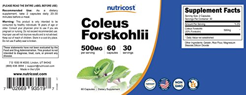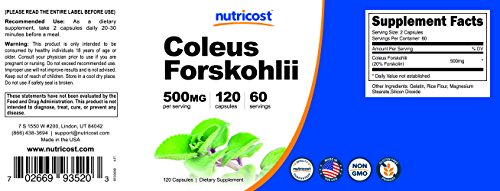 -. Binding : Health and Beauty -. Brand : Nutricost -. Feature : Maximum Strength 500mg Per Serving - All natural, pharmaceutical grade Forskohlii. / Powerful, Natural, Weight Loss Supplement - Coleus Forskohlii Helps Boost your metabolism, Suppress Your Appetite, Burn Fat and helps keep your cravings in check! / 120 Capsules Per Bottle. Each capsule contains an extra strength dose of 250mg, each serving size at 500mg! / Formulated for optimal absorption Coleus Forskohlii starts helping you achieve your goals from the start / Non-GMO, Gluten Free, 3rd Party Tested, Made in the USA -. IsAdultProduct : 0 -. Label : Nutricost -. LegalDisclaimer : These statements have not been evaluated by the Food and Drug Administration. This product is not intended to diagnose, treat, cure, or prevent any disease. -. Manufacturer : Nutricost -. MPN : NC-COLFORCPS -. PackageQuantity : 1 -. PartNumber : NC-COLFORCPS -. ProductGroup : Health and Beauty -. ProductTypeName : HEALTH_PERSONAL_CARE -. Publisher : Nutricost -. Studio : Nutricost -. Title : Nutricost Coleus Forskohlii 500mg Capsules - Maximum Strength Formula