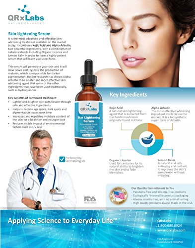 QRxLabs Skin Lightening Serum is the solution you have been looking for. It is the most advanced and effective skin whitening treatment available on the market today. It combines Kojic Acid and Alpha Arbutin, two powerful ingredients, with a combination of natural extracts including Organic Licorice and Lemon Balm to form a highly potent serum that will leave you speechless.