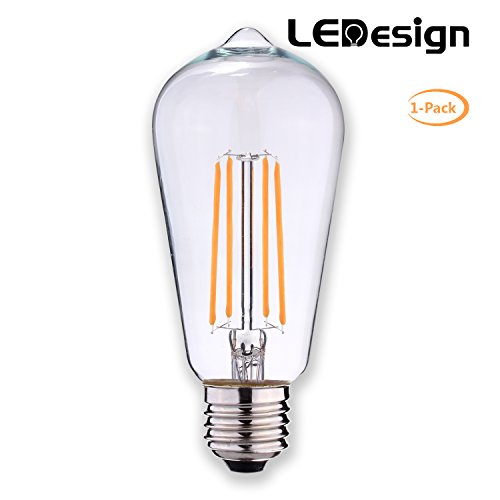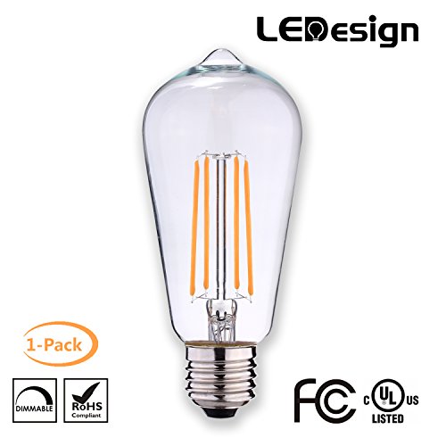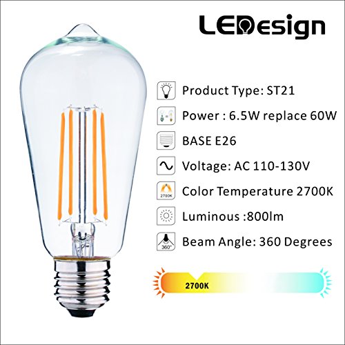 LED Filament Bulb, LEDesign ST21 LED Vintage Filament Light Bulbs, Dimmable, 6.5W (60W Equivalent), 800 lumen, 2700K (Soft White / Warm White), E26 Base, IC Driver, CRI 80+