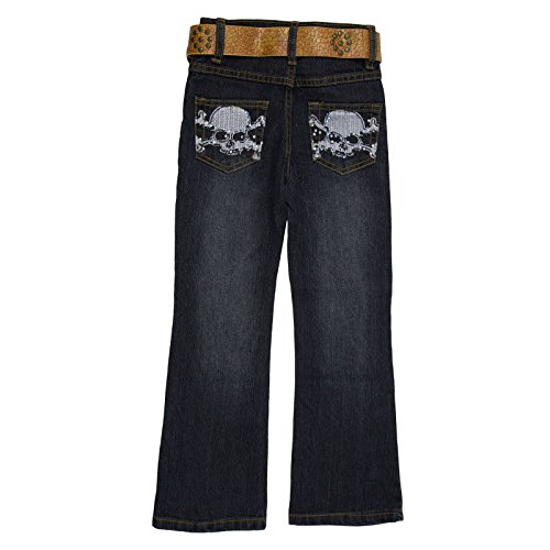 Product Description Great fitting and rugged jeans for everyday use. Belt made of Polyurethane and metal skull and cross bones buckle. Rignstone skull accents. Features two front and back pockets. 0