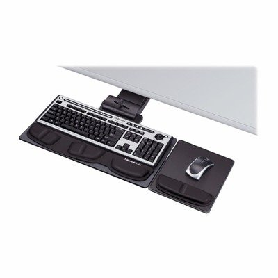 -. Feature : Fellowes® professional executive class keyboard manager. / The ideal size for smaller work stations. / Keyboard mechanism offers total knee clearance plus curved design brings you closer to the desk. / Adjust keyboard tray with a simple one-handed motion. / Customize tilt with keyboard tray adjustment lever.
