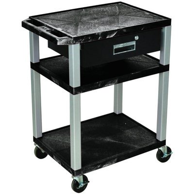Studio : Wilson Publisher : Wilson Binding : Misc. Product Description This Wilson Tuffy Utility Cart puts design, toughness and security in a maintenance-free design that is suitable for virtually any environment. High-density polyethylene structural foam molded plastic shelves and legs won't stain, scratch, dent or rust. U.S.A. Color: Black/Nickel, Material Type: Plastic/steel, Cord Length (ft.): 15, Dimensions W x D x H (in.): 24 x 18 x 34, Lockable: Yes, Wheel Type: Swivel caster, Wheel Size (in.): 4, Shelves (qty.): 3, Shelf Capacity (lbs.): 100, Total Capacity (lbs.): 300, Doors (qty.): 0, Top Shelf Height (in.): 34 0