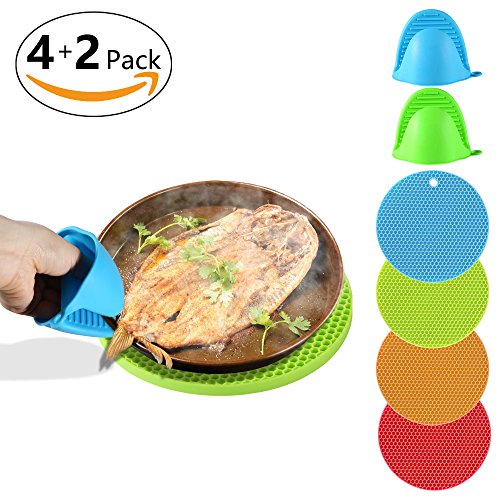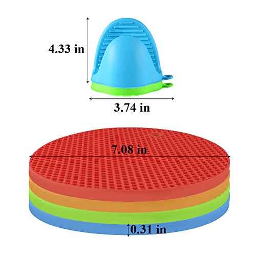 Silicone Trivet Mat, HEMRLY 4 PCS Non Slip Hot Pads Flexible Heat Resistant Coaster with 1 Pair Pot Holders for Modern Home Decor, Safe Essential Kitchen Cooking