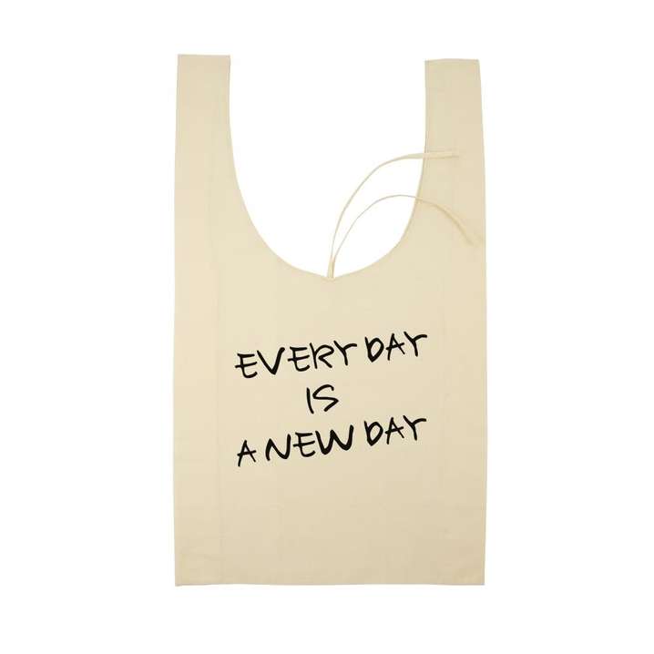 ●ざっくり持てて、物をポンポン入れられる気軽さが魅力。ひもでくるくる巻いておけば、エコバッグとして持ち歩く時も便利なコンパクトサイズに。ちょっとエスプリの効いたメッセージプリントも小粋です。