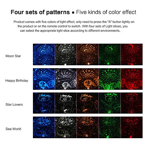 Cool five-color model & 4 Patterns Light Slice: Moon Star(sticked on the light already and removable),Happy Birthday,Star lovers,Sea World.To help you express your love, bless and happiness to your lover friends and family.
