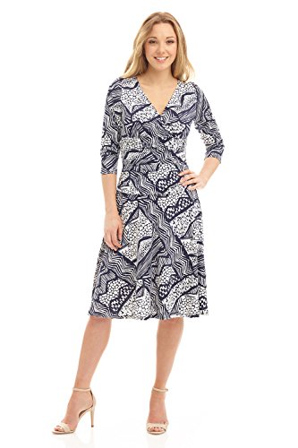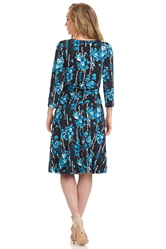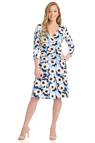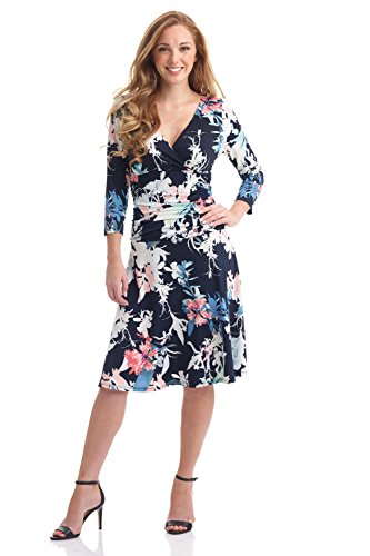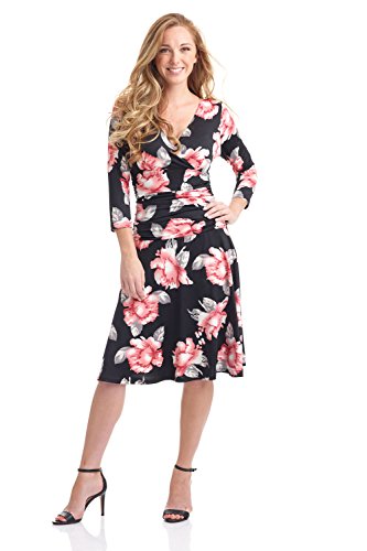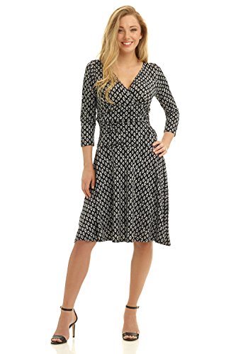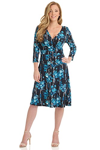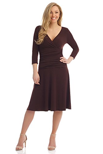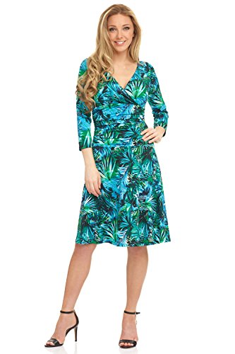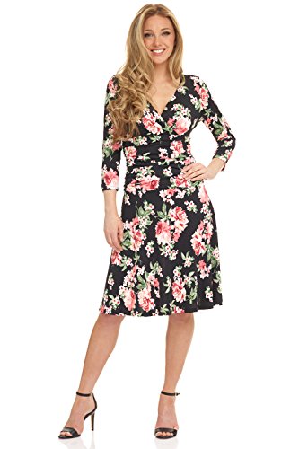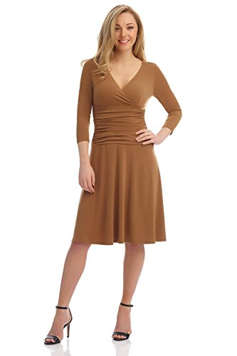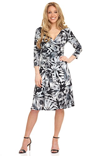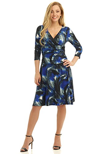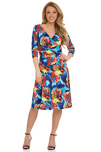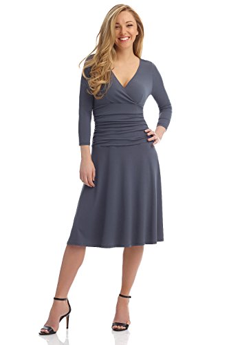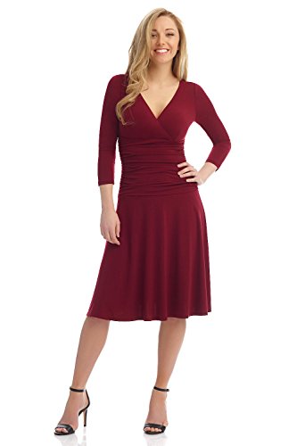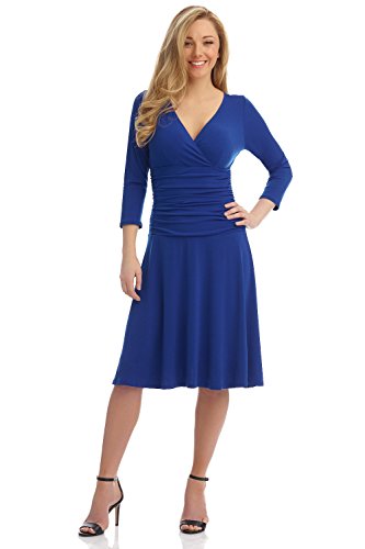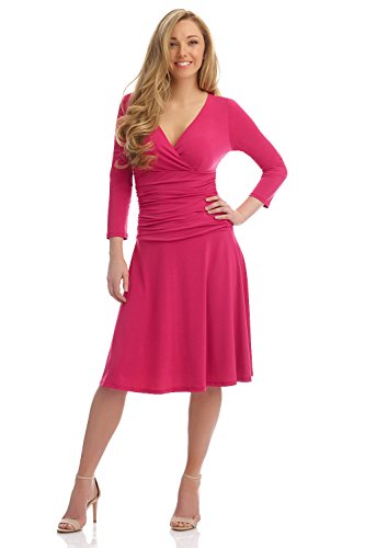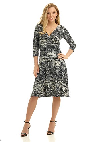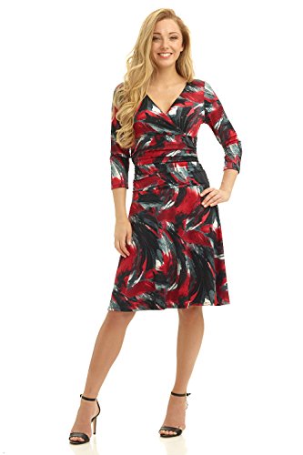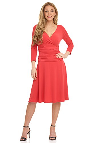 FLATTERING: Surplice crossover neckline elongates your look while still being modest. Wide ruched waist and flared skirt enhance and give an hourglass figure. Knee length skirt is classic and chic.