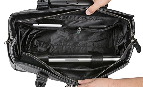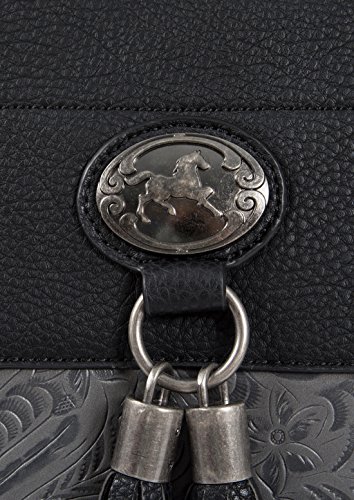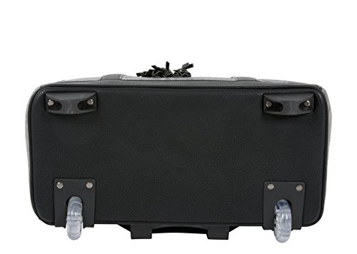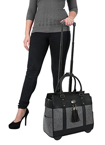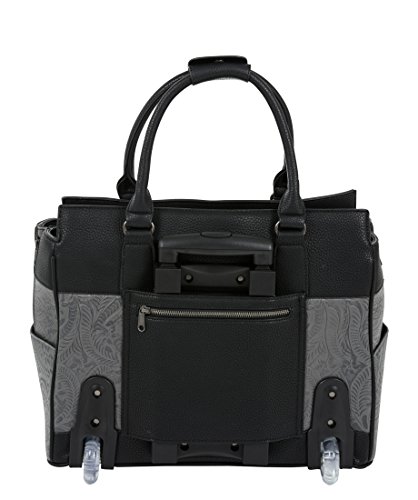 -. Feature : LESS THAN PERFECT. There is color variation in the grey tooled faux leather. Fits under most airline seats when turned sideways. Black pebble texture faux leather exterior with grey tooled style faux leather accents. Makes a lovely laptop computer carryall, rolling briefcase or weekender bag. / Antique silver color horse pendant and hardware. Two accent tassels. A total of six (6) pockets to store your essential items. / Removable padded pocket will fit your tablet, iPad, 12", 13", 14", 15, 16" or 17" laptop. ** Laptops are measured corner to corner diagonally.** The main compartment of the bag will fit up to a 18.5" inch laptop (measured corner to corner diagonally). If you place your laptop in the main compartment of the bag, we sest using a laptop sleeve for added protection. Our padded laptop pocket can be easily removed to make a larger interior space. / Fully lined spacious black interior with large zipper wall pocket plus two open pockets. Back side exterior zipper pocket plus two exterior side pockets. Secure zipper top closure. / Pull out black retractable handle & two durable inline style wheels for easy mobility.