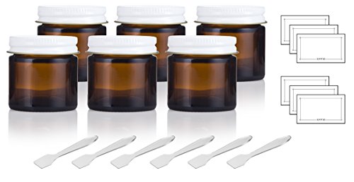 - Includes 6 - 1 oz / 30 ml Amber Glass Straight Sided Jar with White Metal Lids + Spatulas and Labels