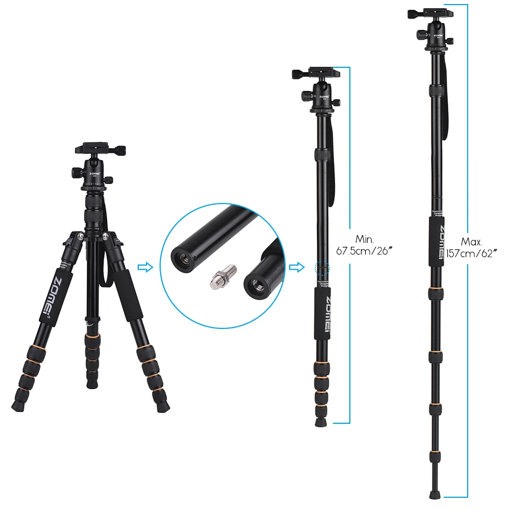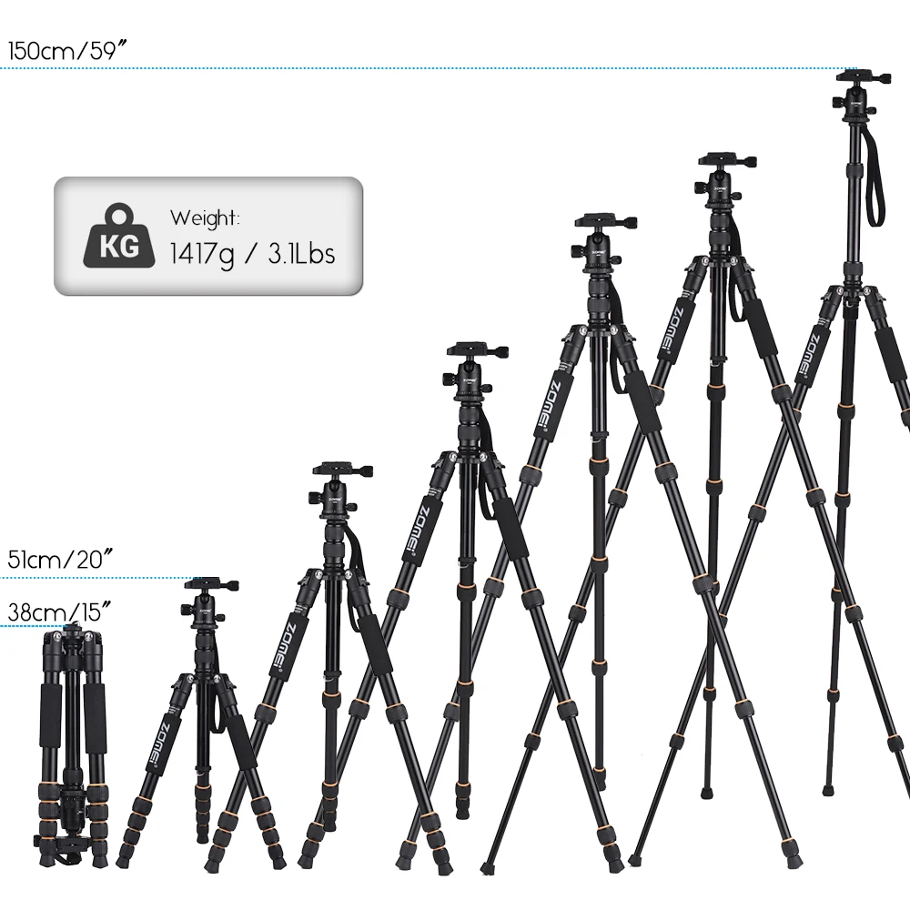 ZOMEI Q555 aluminum alloy tripod is a good helper for outdoor photography. Max. height 63"? weight only 3.1Lbs? folding design? flip-on lock? 3 angle positions? reversible center column? angle adjustable ball head? AS type quick release plate... all these making it a nice choice.