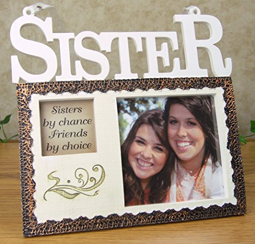-. Feature : Sisters Photo Frame with inspirational message. Perfect gift for a loving sister. / Photo opening, design goes with any decor. Ribbon for hanging on a wall / Inspirational message reads: Sisters by chance, Friends by choice / SIZE: Measures 7 x 7 Inch / Holds a 4 x 4 Inch Photo