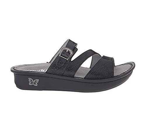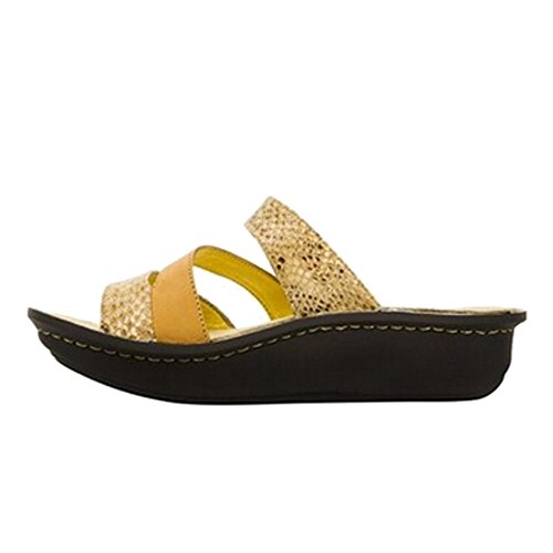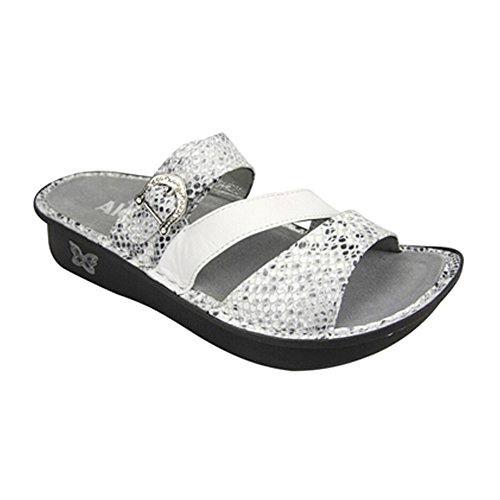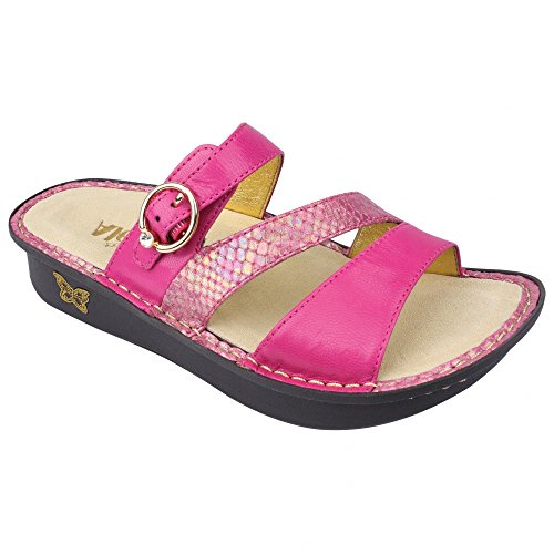 Cool comfort and great style combine in the Alegria Colette sandal. This strappy women's slide sandal has a leather upper with an adjustable closure for a precise fit. The signature "Perfect Fit" footbed combines cork, latex and memory foam to conform to the natural contours of your foot for customized support.Feature
