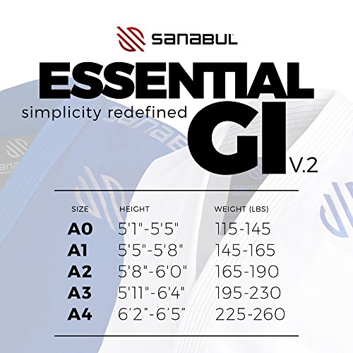 Product Description NEWLY UPDATED Sanabul Essentials Version 2 BJJ Gi (Kimono) The Sanabul Essentials Gi is an elegantly designed gi that is both light on the wallet and on the scale, a necessity for beginners and experts alike. While a few other companies offer a similar price point, their gi's do not include some of the features that make the Sanabul Essentials Gi a great a value. ? Preshrunk fabric. (reviews of the gi shrinking after washing are referring to the previous version of the gi). We listened to customer feedback about the original material and now use a preshrunk ultra light weight pearl weave fabric (ONLY ULTRA LIGHT WEIGHT GI ON THE MARKET TO HAVE PRESHRUNK MATERIAL). Please note that the material is like any other preshrunk cotton material, it will not shrink on a cold wash with hang drying but will shrink slightly in a hot wash or when machine dried. ? Ultra light weight Pearl Weave fabric perfect for a summer training, competitions, or just because you want a light comfortable gi. Even though this is a single weave bjj gi it still has the durability of a double weave kimono ? New size chart to accommodate most body types. Our gi still has a tapered athletic cut without all the excess gi material and bagginess of a traditional martial arts gi ? Many of our customers practice both Brazilian jiu jitsu AND judo with this gi. NEW UPDATED SIZE CHART Size Height Weight (lbs) A0 5'1"-5'5" 115-145 A1 5'5"-5'8" 145-165 A2 5'8"-6'0" 165-190 A3 5'11"-6'4" 195-230 A4 6'2"-6'5" 225-260 Click the ADD TO CART button above and start training with Sanabul products. Satisfaction guaranteed or you can return your unused product for a full refund!