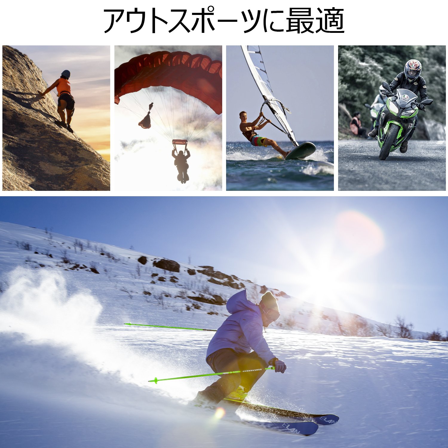 Combination of bike · Bicycle · Ski · Snowboard · Diving · Surfing and other accounts You can shoot clearly during sports.