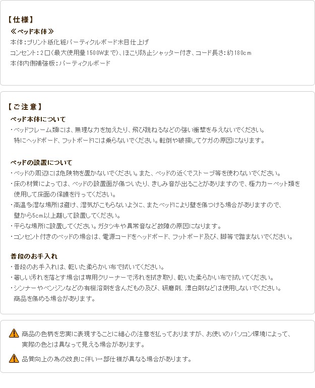 ●商品について:【フラットな床面で布団、マットレスどちらでも使えるベッドです】床面がフラットなためマットレスを使用してもメイキングが楽にできます。棚にはホコリ侵入防止用のフタが付いた2口コンセント付き(1500W)。