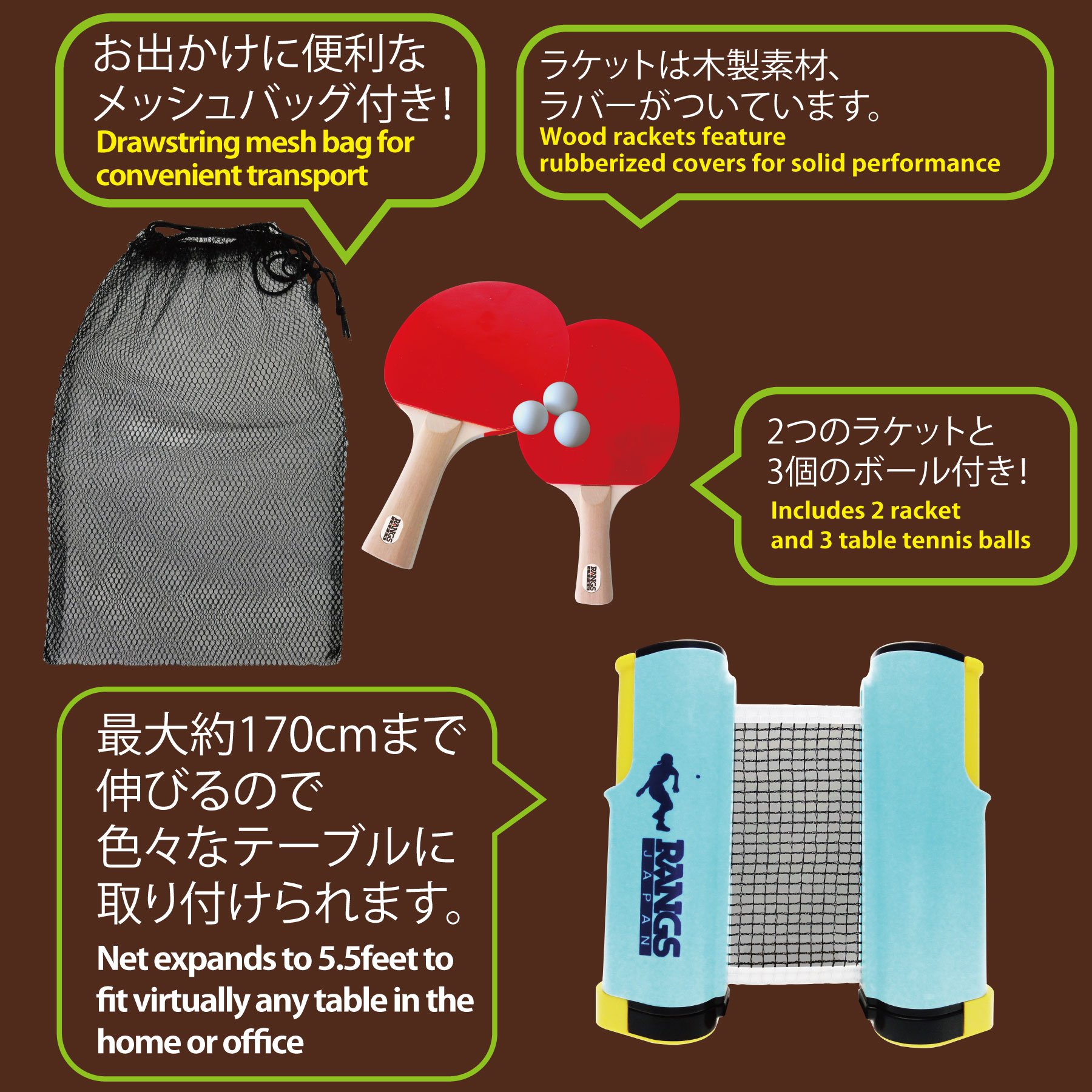 With a stretchable net, it is attached to various tables with a net that extends up to about 170 cm wide.