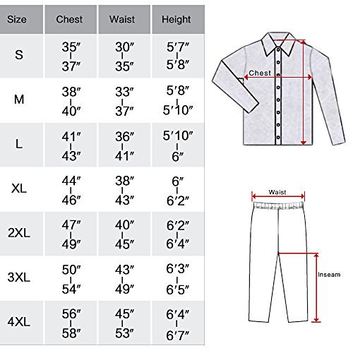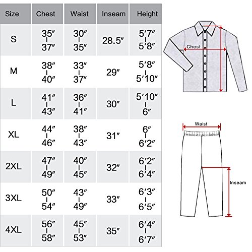 Sizing Recommendations: Small/US------- Will fit Chest 35.4"--39.4"(90--100CM),Fit Waist 27.5"--37.4"(70--95CM) ,Fit Height 5'7"--5'8"(170-173CM) Medium/US------Will fit Chest 37.4"--42.5"(95--108CM),Fit Waist 29.5"--39.4"(75--100CM),Fit Height 5'8"--5'10" (173-178CM) Large/US------- Will fit Chest 39.4"--44.9"(100--114CM),Fit Waist 31.5"--41.3" (80--105CM),Fit Height 5'10"--6"(178-182CM) XL/US-----------Will fit Chest 41.3"--46.5"(105--118CM),Fit Waist 33.5"--43.3"(85--110CM),Fit Height 6"--6'1"(182-185CM) 2XL/US----------Will fit Chest 43.3"--48.8"(110--124CM),Fit Waist 35"--45.3"(89--115CM),Fit Height 6'1"--6'2"(185-188CM) 3XL/US----------Will fit Chest 45.3"--50.4"(115--128CM),Fit Waist 36.6"--48" (93--122CM),Fit Height 6'2"--6'5" (188-195CM) 4XL/US----------Will fit Chest 45.3"--57"(115-145CM),Fit Waist 38"--51"(97-130CM),Fit Height 6'5"--6'7"(195-200CM)