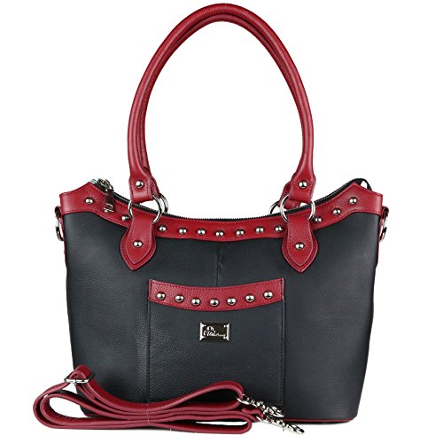 -. Brand : Miss Conceal -. Department : womens -. Feature : TWO-TONE CONSTRASTING 100% GENUINE LEATHER - Accented with bold silver studs/ Front decorative pocket with magnetic closure/ Branded with a signature Miss Conceal emblem / ROOMY INTERIOR - Top zippered access / Fully lined 100% polyester / Two open slip pockets and a zippered privacy pocket / Interior leather lanyard with swivel snap for keys / DUAL CARRING STRAPS/HANDLES - Round handles measure 22" long with 9-1/2" drop / Optional crossbody adjustable strap measures 28"- 48" by 1" (Drop 13" - 23") / Quality, solid silver hardware / LOCKING AMBIDEXTROUS CONCEALMENT POCKET - Access to gun pocket on both ends / Locking concealment zippers with 4 keys / Includes universal elastic, nylon holster / Concealment pocket measures 6" Tall x 9" Wide / SPACIOUS SIZE - Dimensions: 15" (Top) 12-½"(Bottom) Wide x 9 ½ (Lowest point)" Tall x 5" deep Wide x 5" Deep / Bag stand upright with a flat base and raised button feet -. ProductGroup : Shoes -. ProductTypeName : HANDBAG -. Size : Medium -. Title : Concealed Carry Purse - The Renee Two Tone Studded Tote by Miss Conceal - Genuine Leather