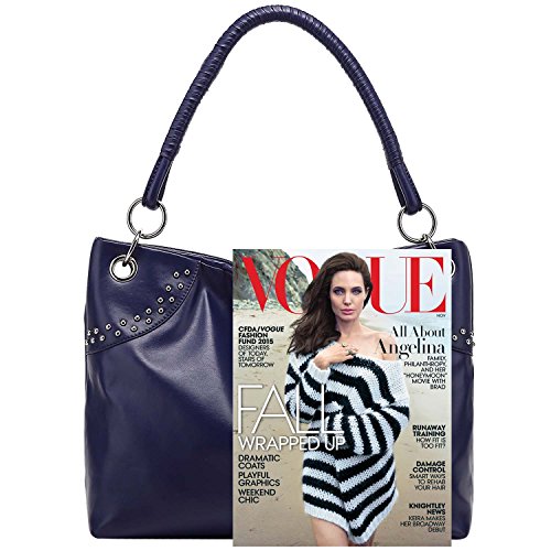 -. Feature : Made using Man-made Synthetical PU Leather / Woven handle with rivet detailing / Zippered top closure and Synthetic Lined Interior / Rhinestone Studded Exterior / Approximate Dimensions: Exterior - 15.7" L X 11" W X 3.9" H; Handle Drop: 7"