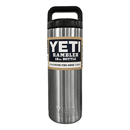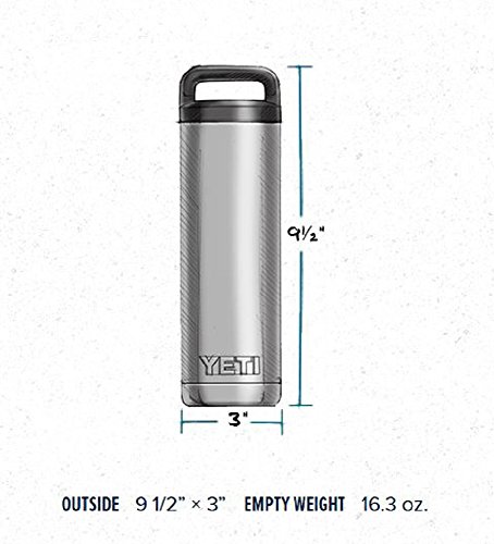 The Rambler 18 oz. bottle stands 9 1/2 in high and has a diameter of 3 in. The YETI Rambler 18 oz. bottle is sized to fit in standard sized cup holders