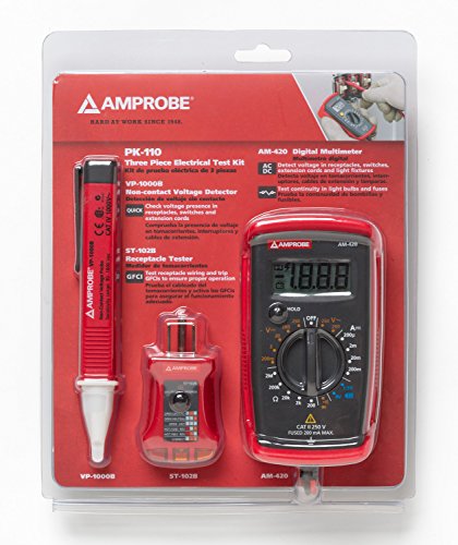 Residential electrical test kit includes AM-420 Digital Multi meter, VP1000B Non-Contact Voltage Probe, ST102B Socket Tester with GFCI and all required batteries