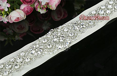 QueenDream Silver Crystal Beaded Ivory Satin Bridal Sash Wedding Belt for Bride