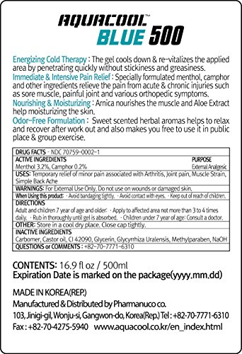 Studio : Pharmanuco co. Publisher : Pharmanuco co. Binding : Health and Beauty Product Description What is Aquacool Blue? - Aquacool Blue cools down the applied area and relieve the pain from acute injury by manipulating the nerve system and also slows down blood flow, reducing inflammation and swelling.