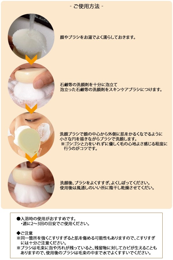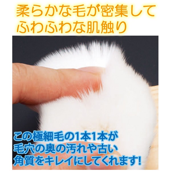 | ブラシの極微毛細が肌の毛穴の凹凸に入り込み、毛穴の汚れを取り除きます。毛は、動物毛よりも細菌が繁殖しにくい清潔なカネ ゴート(モダアクリル繊維)を使用。刷毛製法で作られているため、毛が落ちることはほとんどなく、長くお使いいただけま す。 |