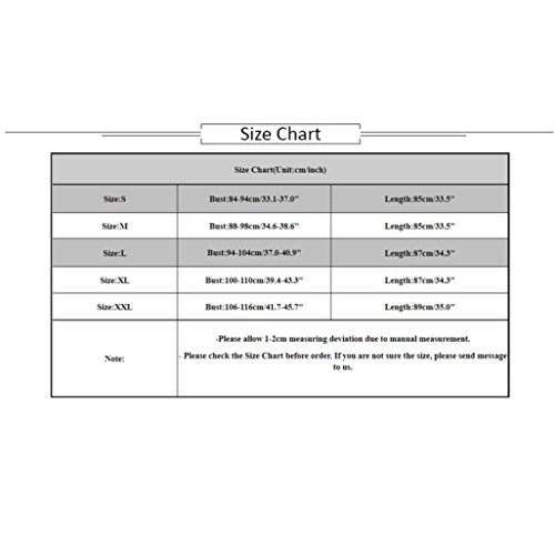 Size Chart:(Unit:cm/inch/1 inch = 2.54 cm) ??Size:S ---- Bust:84-94cm/33.1-37.0"?---- Length:85cm/33.4"? ??Size:M?---- Bust:88-98cm/34.6-38.5"?---- Length:85cm/33.4"? ??Size:L?---- Bust:94-102cm/37.0-40.1"---- Length:87cm/34.2"? ??Size:XL?---- Bust:100-106cm/39.4-41.7"---- Length:87cm/34.2"? ??Size:XXL?---- Bust:106-110cm/41.7-43.3"?---- Length:89cm/35.0" ???????????????????????????????????????????????????????? 0