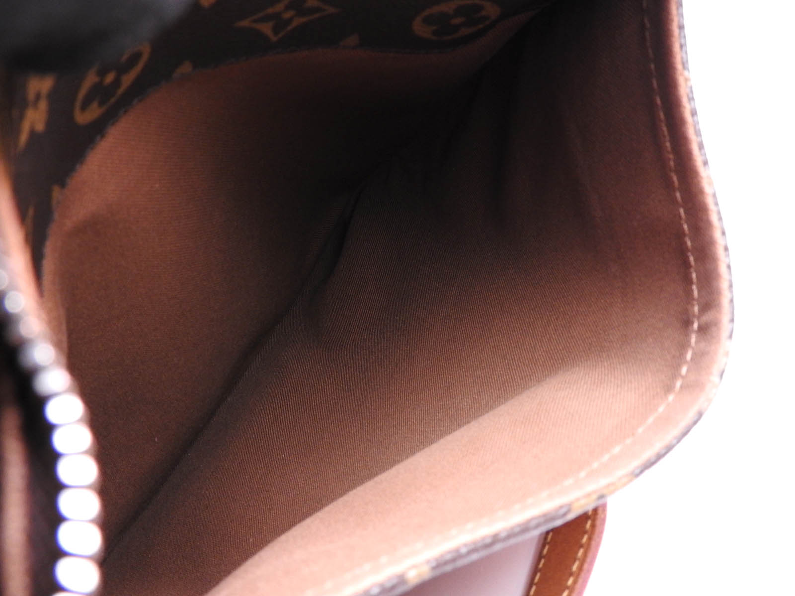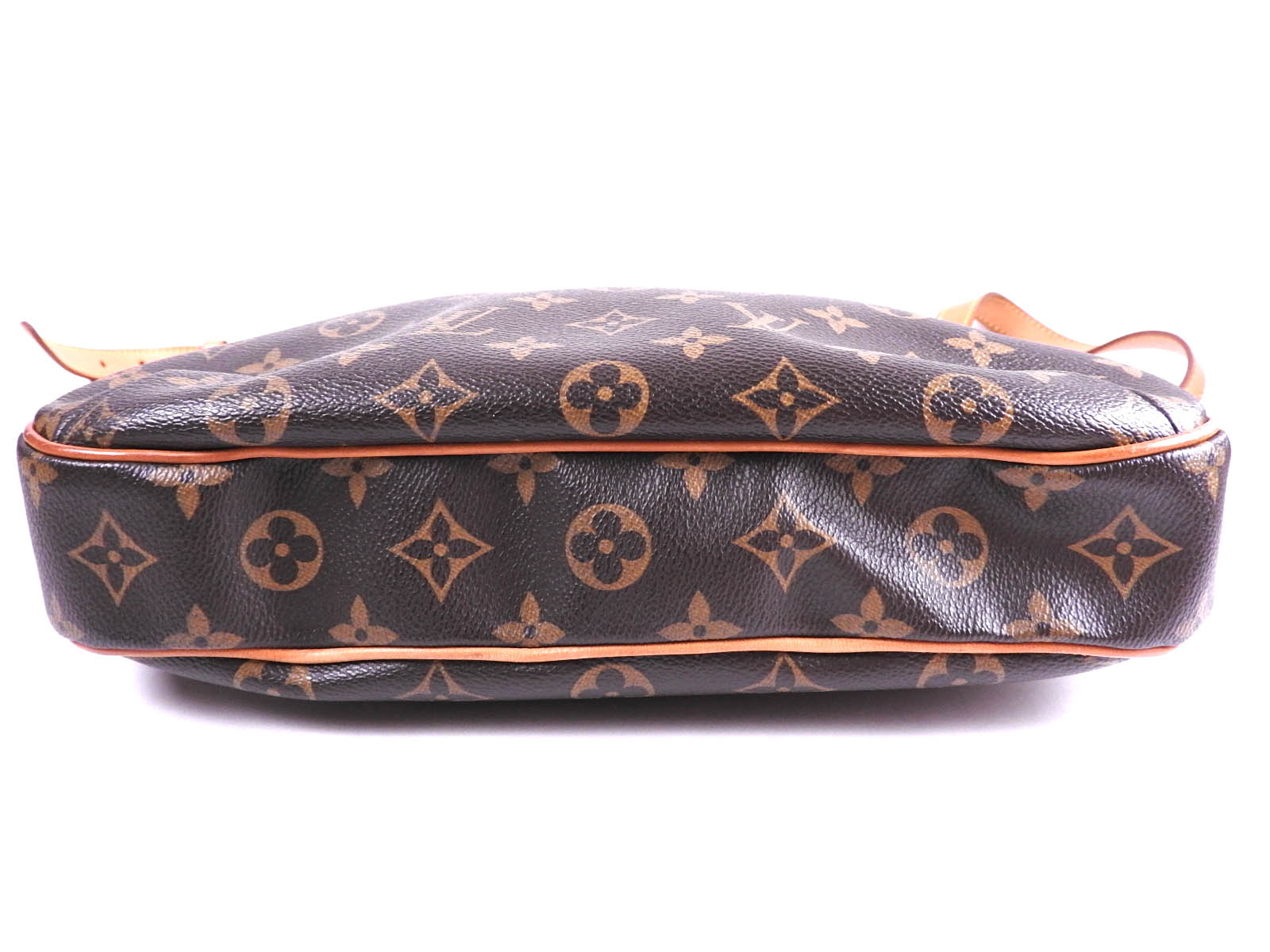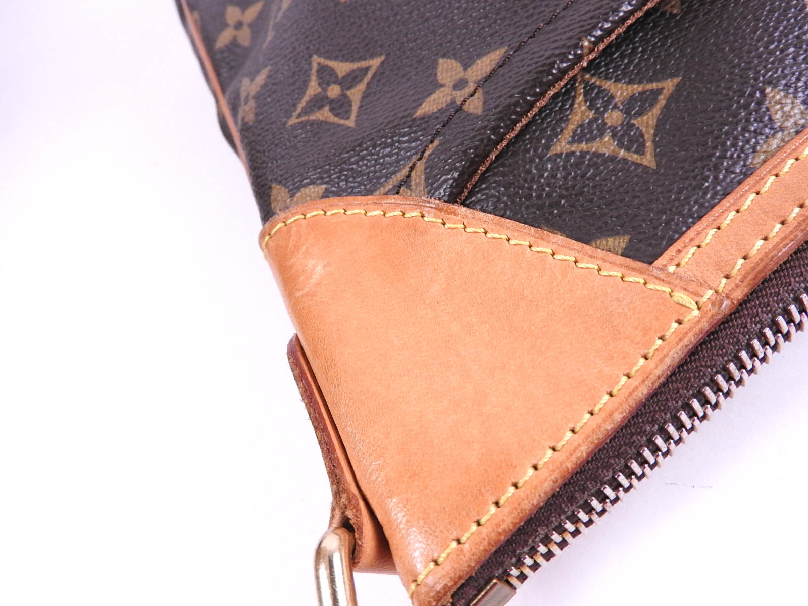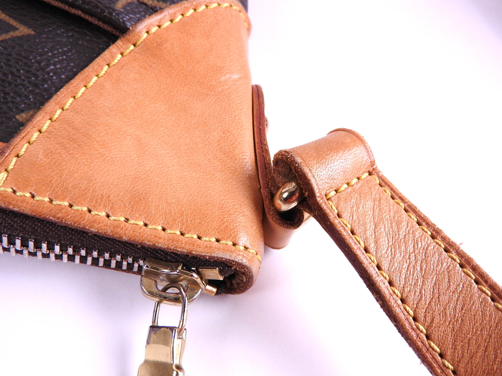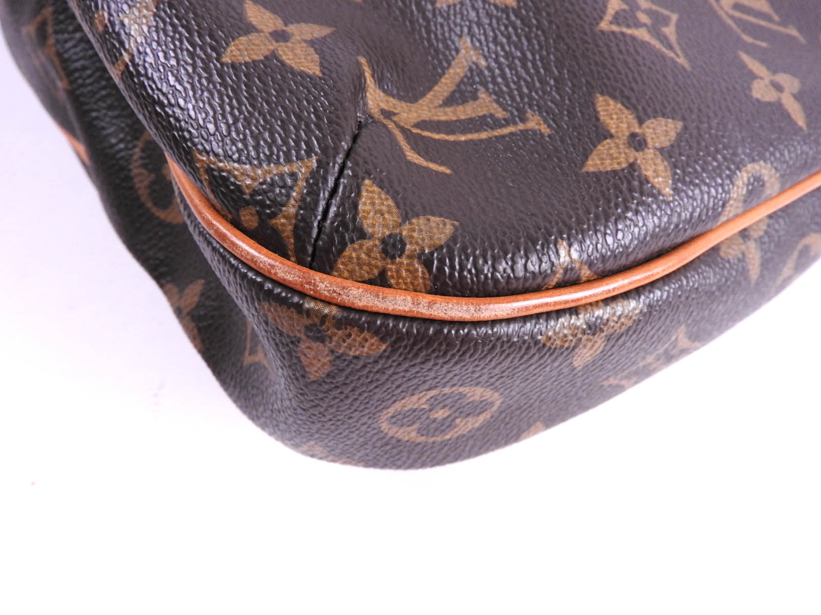 Monogram: Slightly used feeling. Slight stains and wrinkles. Leather: Used feeling. Some stains, wrinkles and tanning. |