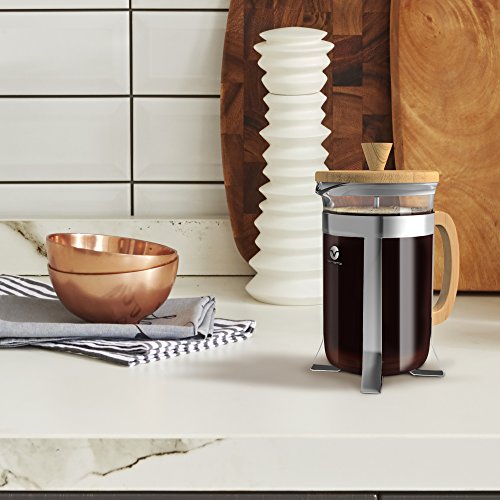 Vremi Pardon My French Press. The cool kitchen tool for preparing single serve or large sized hot and flavorful rich coffee. Made of premium stainless steel that will never tarnish or become discolored. The glass carafe is made of high quality and durable borosilicate glass. The finely honed spring-loaded stainless steel mesh plunger makes poured coffee free of grounds every time. Unlike other French Presses, this has a broad, easy to grip handle made of bamboo, with a sleek and unique contemporary design. The simple yet elegant design of this coffee maker can easily fit into any color kitchen interior. Great for occasions like dinner parties, office parties or meetings, where you can brew your guests' coffee right at the table. You can even bring this manual coffee machine with you for outdoor activities like camping or hiking (just make sure to place it in a safe travel container). This is also a perfect Christmas, wedding or birthday gift for people who like to enjoy an extra cup of hot coffee or tea at work.