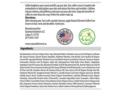 -. Feature : Coffee Face Cream, Anti Aging & Anti Wrinkle Moisturizer, Organic & All Natural, 4 oz., Caffeine Tightens Fine Lines, Relieves Redness and Irritation, Loaded with Antioxidants / LOVE THE SKIN YOU'RE IN. With our Coffee Face Cream, you can take years off the natural way! Caffeine helps tighten the skin to reduce wrinkles and fine lines, as well as aiding in circulation. This hydrating moisturizer will firm and tighten your skin with only the best natural ingredients, leaving your skin silky smooth, fresh and youthful. Natural Element has the first coffee skin care line that smells amazing and is healthy and natural! / COFFEE IS ALWAYS A GOOD IDEA. We all love the smell of coffee, but did you know that coffee is even great in skincare? Caffeine constricts blood vessels to reduce redness and help calm irritated skin. This facial cream helps reduce rosacea and facial flushing, and can give you a beautiful, even skin tone. Not only does this moisturizer smell like a nice fresh cup of coffee, but it's great for your skin!