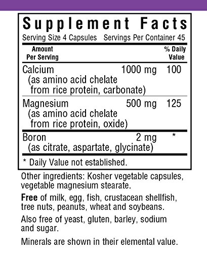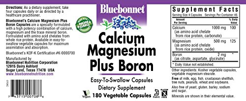 Bluebonnet's Calcium Magnesium with Boron is combined to help maintain bone strength. Together, calcium, magnesium, and boron can help prevent osteoporosis. 68% of Americans aren't getting enough calcium and 75% are deficient in magnesium. These capsules are specially formulated with a high potency combination of chelated calcium, magnesium, and the trace mineral boron. Formulated with a full range amino acid chelates from whole rice protein. Available in easy-to-swall vegetable capsules for maximum assimiliation and absorption.Feature