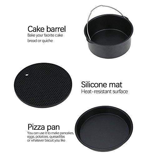 • ✔5-PCS AIR FRYER ACCESSORIES KIT: Includes Includes 1 Cake Barrel, 1 Pizza Pan, 1 Metal Holder, 1 Multi-Purpose Rack with Skewers and 1 Silicone Brush. The Pizza pan an cake basket were made of Teflon, heat-resisting, non-viscous, stand wear and tear, durable, high strength, good thermal conductivity