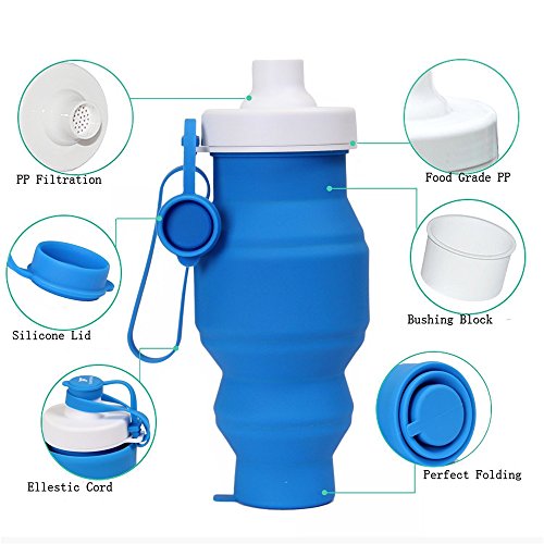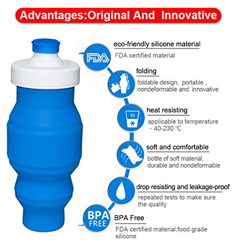 -. Feature : 1. SAFE MATERIALS: The bottle is made of medical grade silicone as well as food grade PP&PC, 100% BPA-free, non-toxic, odorless, FDA/LFGB/SGS approved, safe and eco-friendly. / 2. HEAT RESISTING: The temperature resistance betwwen -40° and 230°so you can put boiling water or ice-cold water in the bottle / 3. INNOVATIVE DESIGN: Foldable and portable, easy to roll up and fit inside a bag. The wide-mouth design makes it easy to add fluids, ice cubes, and to clean. Designed for bicycling, running, camping, hiking, mountaineering, travel, exercise and fitness. / 4. MAINTAINING ACTIVE LIFESTYLE: Holds up to 530 mL of liquid; provides adE.q.u.a.t.e hydration for your entire day; refillable for outdoor use and promotes a healthy and active lifestyle / 5.WARRANTY GUARANTEE: 90 days money back guarantee if there have any quality problem.