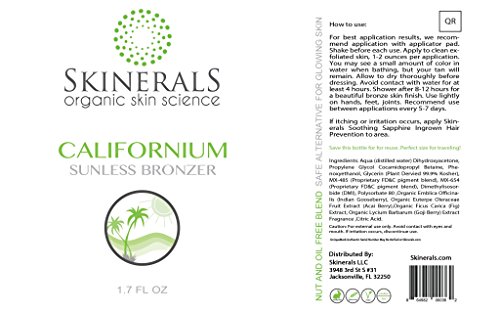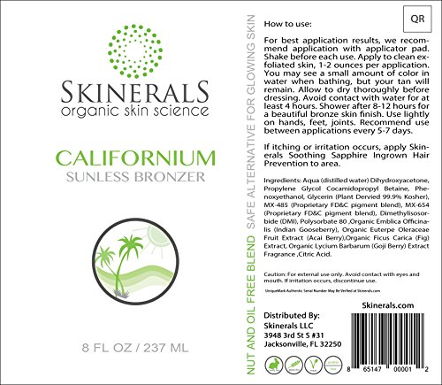 -. Binding : Misc. -. Brand : Skinerals -. Feature : Skinerals focuses on using Organic ingredients over non-organic whenver possible. / Safe-effective alternative to sun tanning or using tanning beds. / Amazing bronze glow without splotchy patches that look unsightly! / Natural looking sun kissed beauty that lasts up to 7 days. / Every single Skinerals bottle comes with Authentic Serial Number for customer security. -. IsAdultProduct : 0 -. Label : Skinerals -. Manufacturer : Skinerals -. MPN : 865147000012 -. PartNumber : 865147000012 -. ProductGroup : Beauty -. ProductTypeName : BEAUTY -. Publisher : Skinerals -. Studio : Skinerals -. Title : Skinerals Califinornium Sunless Bronzer Organic Self Tanner for Safe Alternative to Sun Tanning