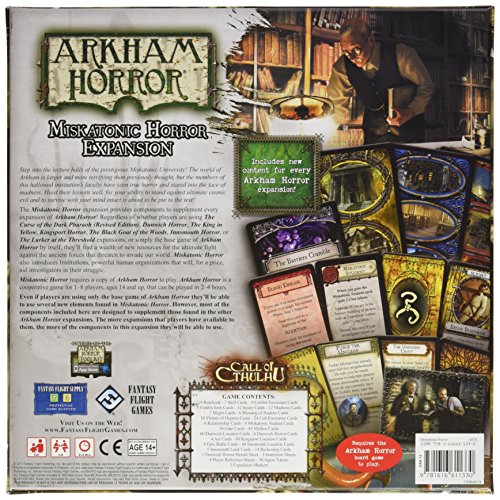 Miskatonic Horror is a new type of Arkham Horror expansion that builds upon the materials found in the ample library of other Arkham Horror expansions. While the components and rules found in Miskatonic Horror can be enjoyed with only the Arkham Horror base game, the more expansions you incorporate, the more aspects of Miskatonic Horror you can enjoy. 0