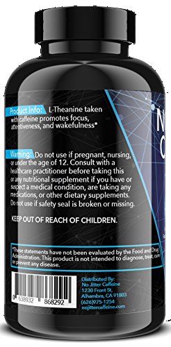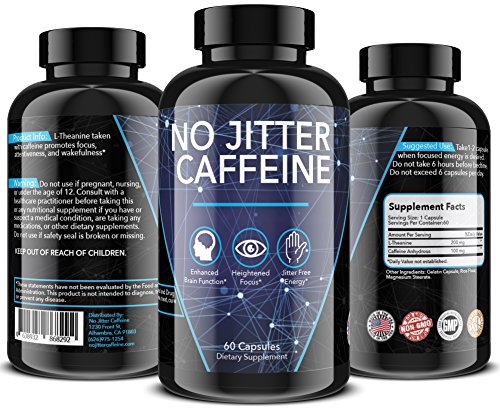 Studio : ABH Pharma Publisher : ABH Pharma Binding : Health and Beauty Product Description No-Jitter Caffeine combines caffeine and L-Theanine to enhance mental alertness and maximize energy, without the jittery, irritable or restless sensation accompanied by many other energizing supplements. Use this pill as desired to promote stamina, focus and efficiency, not to exceed 6 capsules within 24 hours. No-Jitter Caffeine is non-GMO and gluten-free. It is GMP-certified and is made in the USA. Each bottle contains 60 capsules. 0