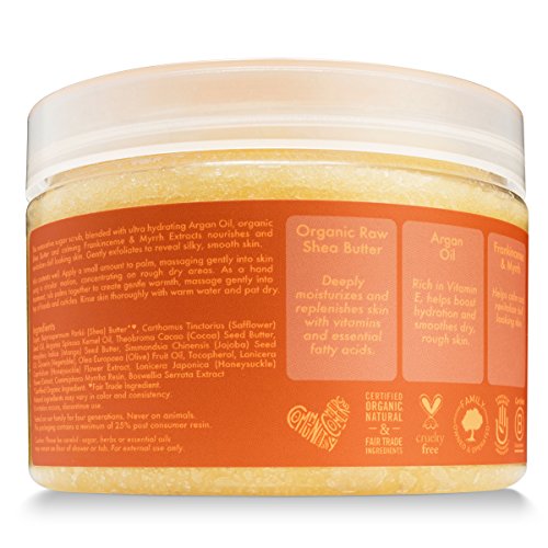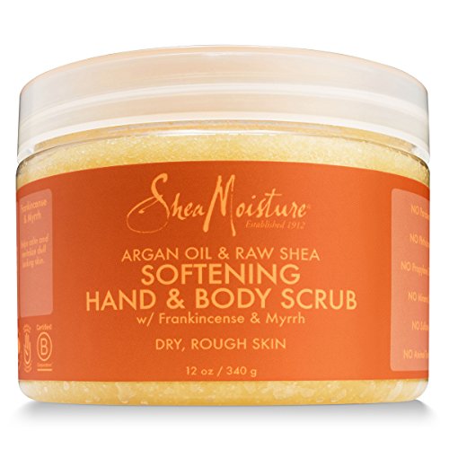 Revive & Revitalize Rough, Dry Skin SheaMoisture Argan Oil & Raw Shea Butter Hand & Body Scrub cleanses skin of pollutants, impurities and daily, dirt and grime to reveal younger, fresher looking skin. Argan oil enriched with vitamin E heals and repairs dry, rough skin while Frankincense and myrrh extracts have anti-inflammatory properties which calm and soothe dry, irritated skin. Trademark certified organic raw shea butter delivers intense moisturization which keeps the skin soft & supple.